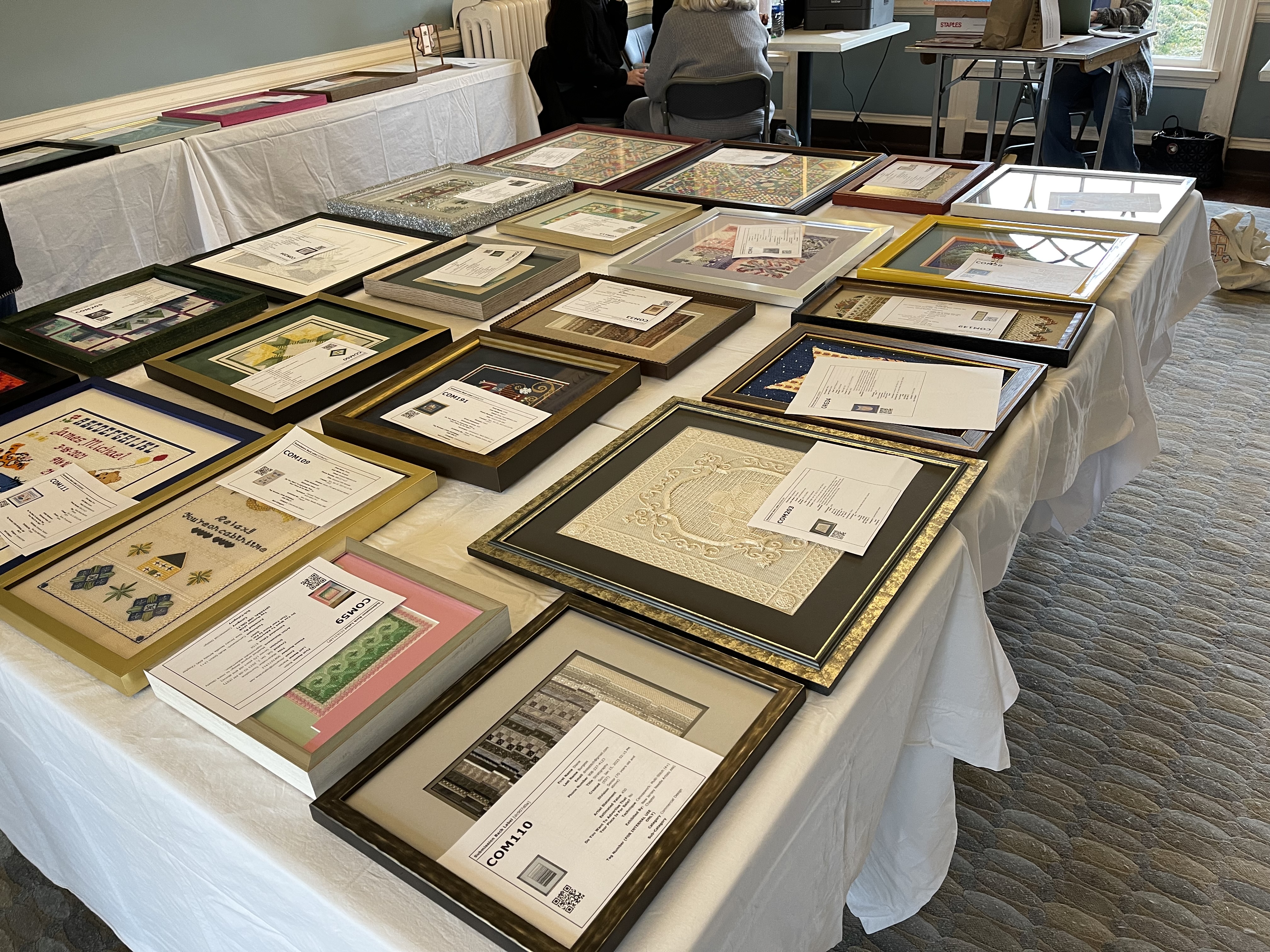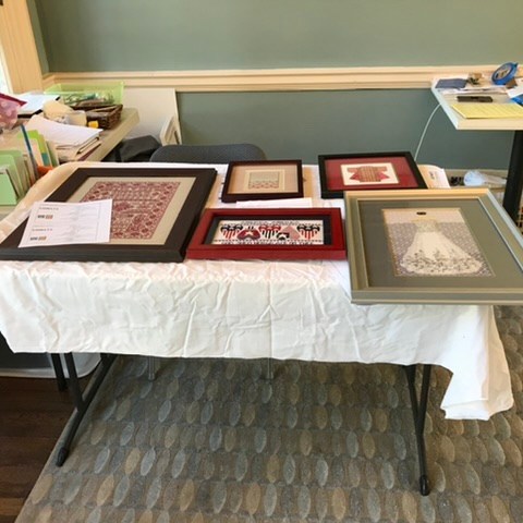 This morning we headed over to Woodlawn to submit the 27 pieces from 15 NJNA members. As always, the volunteers who staff the Exhibit were happy to see us and expressed their appreciation for our continued support of the fundraiser. The needlework filled the trunk of my Mazda 3!