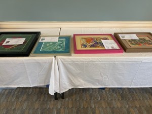 As we walked around the tables examining and logging the pieces, we did discuss the judging process. I was told that the judges see the pieces exactly as shown in the photos – placed on the tables. The judges do not see the back of the piece at all. They are also instructed to evaluate the stitching only – how the piece is finished, the condition of the finish, and whether the ground material has buckled are not considerations in the judging process. I thought that information was good to know.
