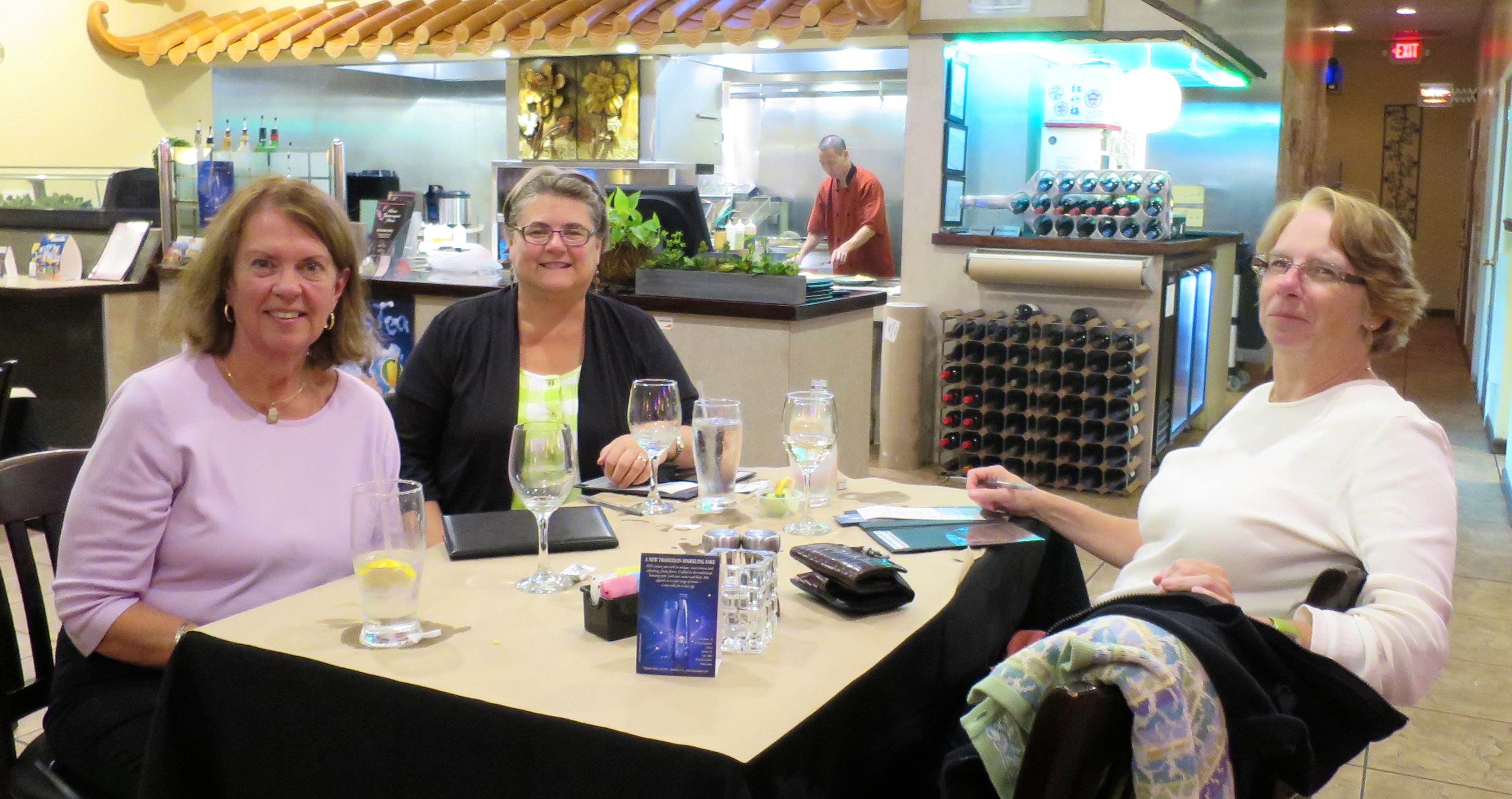After a bit I got up to use the rest room. As I was returning to the table, the woman who had been to my left got up and whispered to me, “Barbara, I know you.” It took me a moment to place her since she was out of context. I soon realized that this woman was Deb R. I knew her from the shop in San Mateo, Luv2Stitch, where I hang out to stitch while visiting the west coast. She has also been present at the few ANG chapter meetings out there that I have managed to attend.