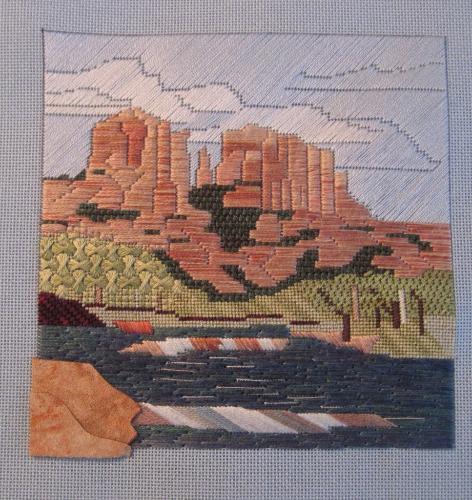 We talked about the various other stitches and then wrapped up the afternoon working on the sky. It is a Bargello pattern done in five different threads as well as an empty row. The order of the threads varies throughout the sky. Some of my fellow stitchers do not care for empty canvas so they will eliminate the empty row. We were given a pattern to follow but I went out on a limb and actually developed a random pattern. The compensation around the lettering was discussed at length and I will approach it with caution.