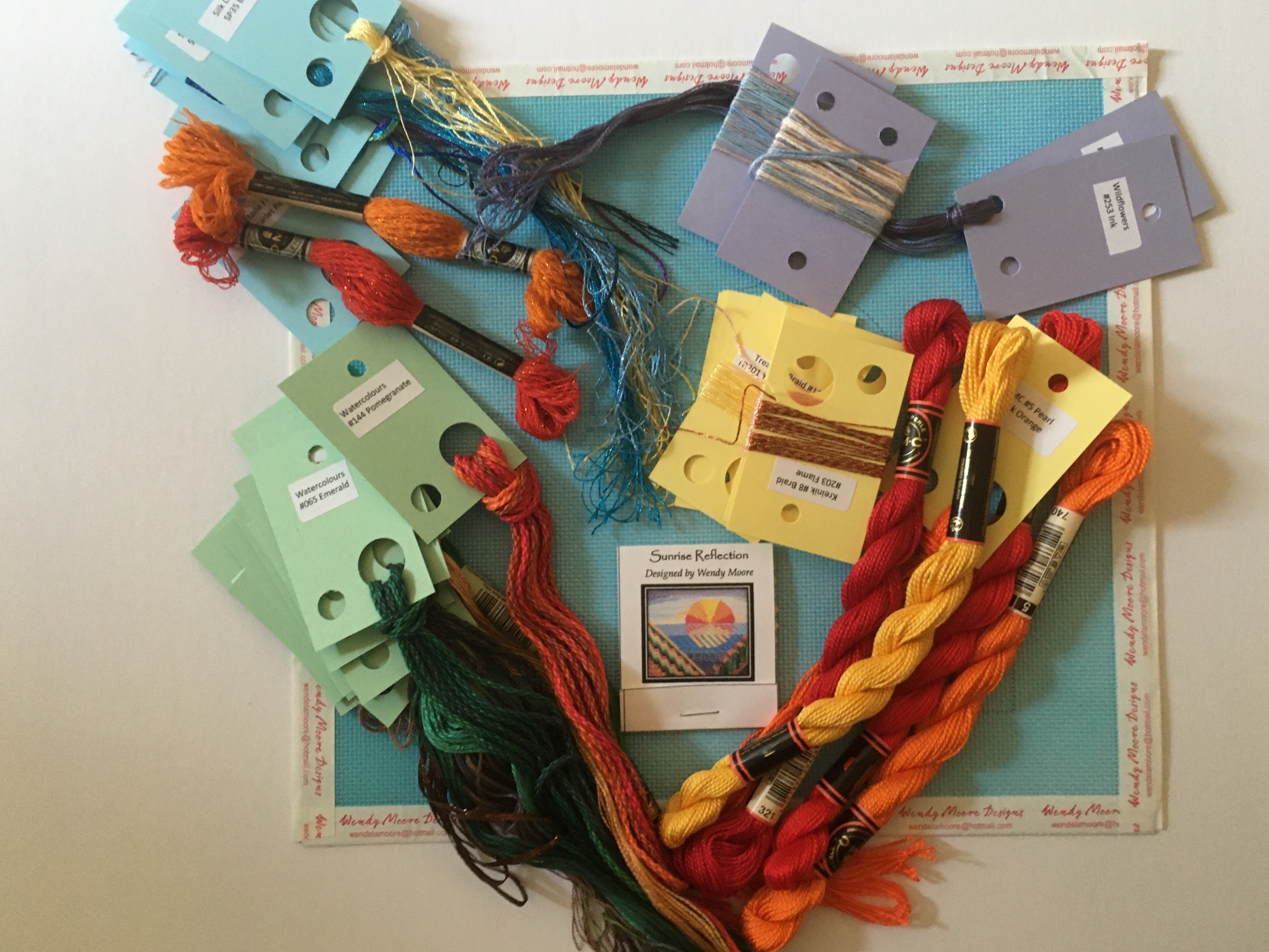 Wendy Moore’s class, Sunrise Reflections, will be taught in four sessions separated by a week. Each session addresses an area of the design. The threads are separated into bags for each section of the canvas which is in one session. There are numerous threads used and since many of these are more expensive threads, they are cut to the amount needed and put on thread drops. The Land section has 15 threads on green drop cards in a bag. The Sun has 8 threads on yellow cards. There are 9 threads on blue cards for the Water section and the bag for the Sky has 4 threads on lavender cards.