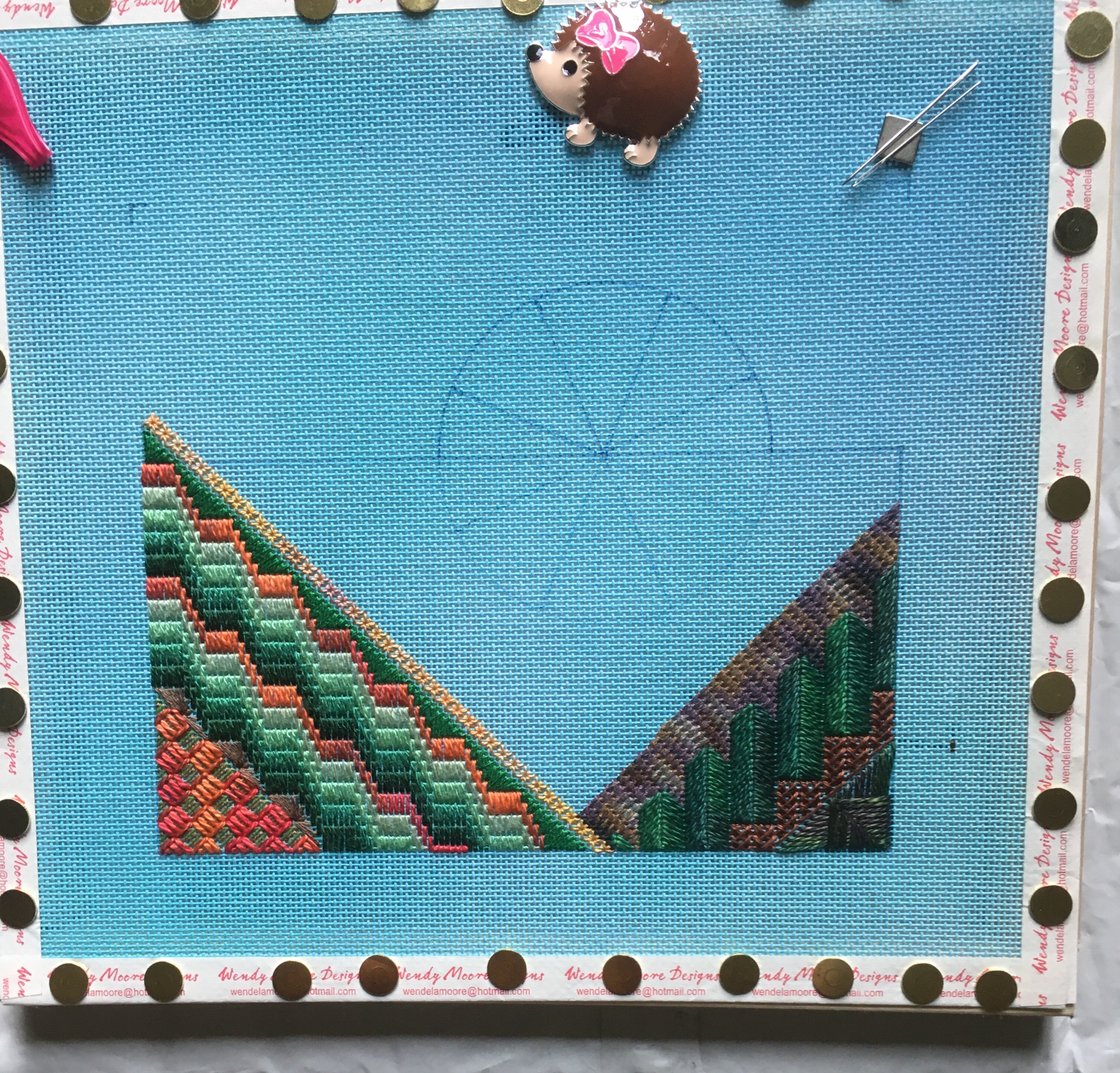 On the right side you can see pine trees, a slanted Gobelin, with trunks, a VanDyke stitch over a Fyre Werks for some glisten. Above the trees for the mountainside is an overdye Diagonal Roumanian (fun to stitch but a bear to remove!). The base is a Sprat’s Head to anchor that side.