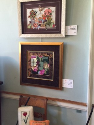 So, now I was inside the exhibit and there was such eye candy! The work across all media was really breathtaking. I saw cross stitch pictures that looked like photographs and stump work that had incredible detail. The gold work was amazing. I did find amusement that the morning guides were from the local garden club and I did a bit more explaining to them than the other way around. Yet, they were quite charming and lovely to chat with. They did explain some interesting things about one or two of the pieces in each room. One thing they did explain was that the ribbons had not yet arrived. So, on the name tags, the entries that won ribbons had different colored dots, indicating their place. Of course I couldn’t tell what the different categories were. I also over heard that people who had entries could have the guides get a docent and then they could take a photograph of their own entry.
