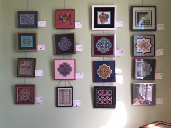 Now, I started to look for the chapter display in earnest. It was no where to be found on the ground floor. I went upstairs and I still didn’t see them. Finally I went into a bright sunny room that had no furniture, but a whole uninterrupted wall for display. There they were! I also saw my second piece, which was a Tony geometric counted piece. However, I quickly looked away because I noticed Mary D’s piece ( I believe it is her Frankie piece) had a red dot on it! I was so excited for her. I quickly tagged the guide to find out what she had won and it is a second place. Sorry that I don’t know the category. Congratulations Mary! At any rate, I began to look at the wall in earnest and it was then that I noticed that my name tag had a red dot also. I kept looking back to make sure my eyes weren’t playing tricks on me. What great positive reinforcement for a first time exhibitor! I also noted with amusement that the “other” Barbara L. had a piece on the same wall. Thankfully, the two pieces were labeled correctly. I took one last look around and then I was off to In Stitches.