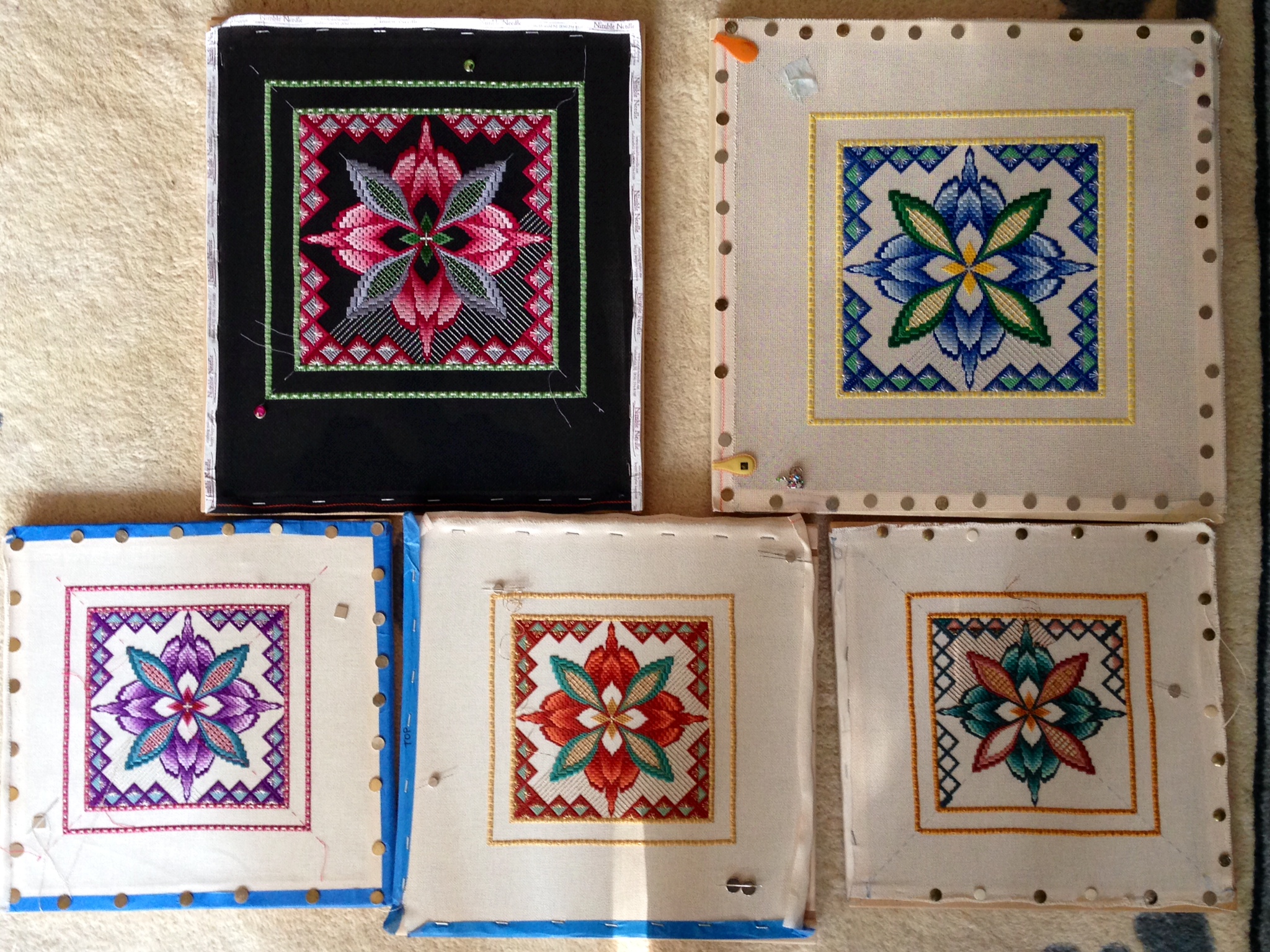 As usual, we had great conversation to go along with the cursing of trying to figure out what we were doing. We had quite a few discussions about what octagon we really had done or were doing (such confusion!) as well as what the stitch guide was really saying about the double fans! We also had lots of thoughts on where a stitch was to go as well as what threads people were using in different situations. It was interesting to note the different effect that resulted in the different colorways. For instance, Dee’s and Diane’s top octagon are the same yet the effect is totally different. As we’ve been saying, this is quite a challenging, although fun, piece for most of us that we probably would have put in the UFO pile if we weren’t doing it as a group. Here’s to the power of peer pressure and comaradarie!